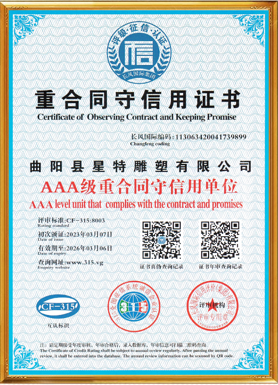 曲陽縣星特雕塑有限公司成立于2008年,總部位于具有千年雕刻文脈、擁有“中國雕刻之鄉”美譽的河北省曲陽縣,是一家集創意設計、雕塑生產、雕塑藝術創作、景觀環境藝術為一體的雕塑公司。在十幾年的時間里,我們從蹣跚起步,再到砥礪前行,始終持初心、踐匠行,為弘揚曲陽雕塑文化做出自己應做的貢獻。目前,我公司與中央美術學院、清華大學美術學院、西安美術學院等全國知名美院機構保持長期的交流與學習,并與多個國家雕塑、美學專家老師合作、溝通、共享雕塑帶來的無國界藝術享受。成功設計并制作了數百個城市雕塑作品,受到了當地政府、主管領導及客戶的表彰和贊譽。公司已通過(ISO9001)國家質量體系認證,將繼續秉承誠信、自律、求智、進取的企業精神,和崇尚榮譽、捍衛責任、創造價值的企業核心價值觀,弘揚中華藝術,振興民族產業,發展星特企業,用事實說話,用作品見證,力爭打造一個生命力強勁的民族雕塑企業向著國際化現代企業集團邁進,為曲陽雕塑文化的發揚做出重要貢獻。